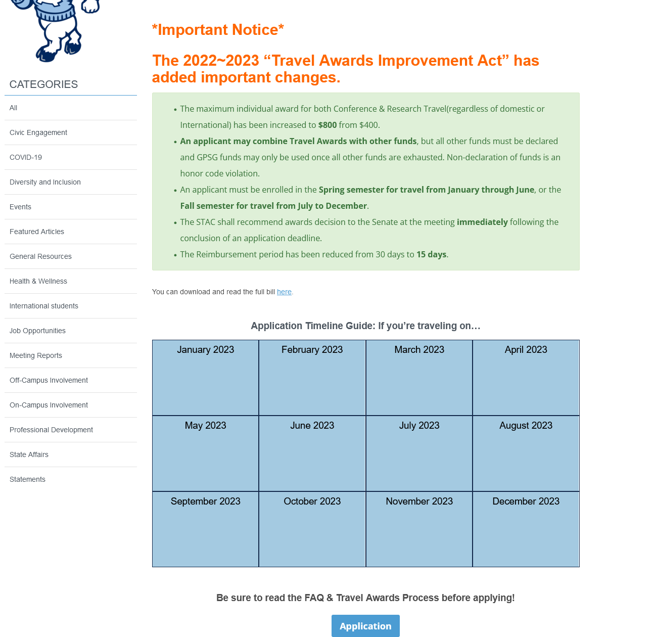 The Travel Awards page crew came to me and asked to revamp the table entirely. It took me awhile to understand the table itself, which is a testament to its desperate need for a change. The overall table is trying to communicate the deadline of application for travel fund awards depending on the travel date. Problem is, the table itself is very confusing. The Travel Cycle does not properly reflect the date(Travel Cycle December= Jan 1st ~ June 30th), the senate approval overlaps, and is overall just a very complex table that does not serve the users. Not only that, but the page had numerous broken links and outdated information. Can you try to tell me when you would need to apply by if you are travelling on February 1st?